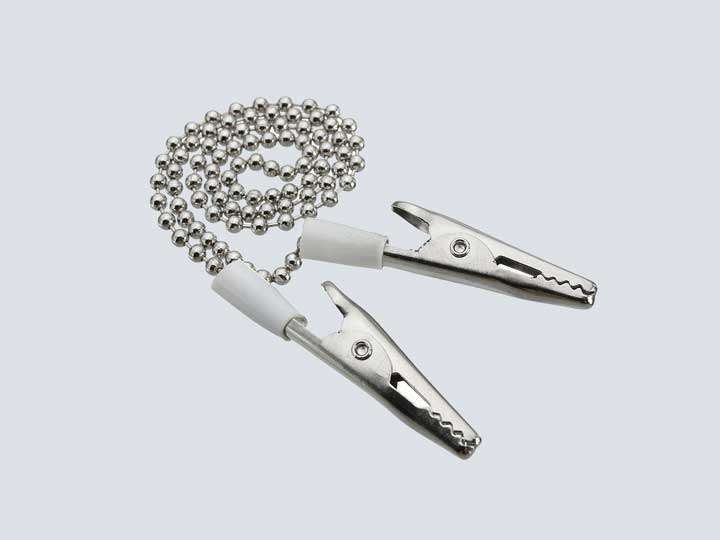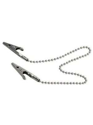 Dental bib clips with metal ball chains and spring-loaded clips. It is used to hold dental bibs in place securely and is easy to use. Ball chain is about 36.5 cm long, total length (ball chain + clip) is about 42cm.