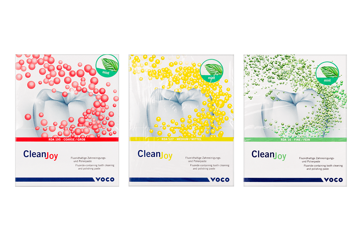 Clean Joy is a fluoride-containing tooth cleaning and polishing paste, designed for the removal of plaque, extrinsic discoloration, and for polishing teeth as part of professional tooth cleaning or prior to whitening.