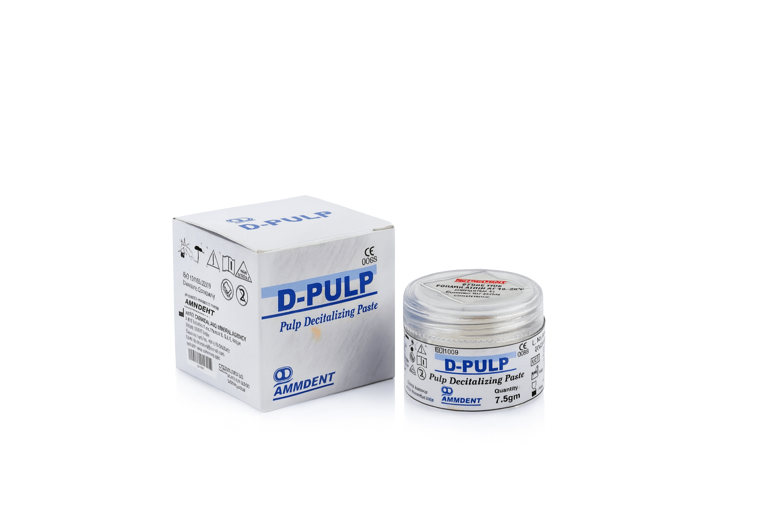 The Ammdent D-Pulp is a devitalizing paste containing paraformaldehyde used in endodontic therapy for the painless devitalization of vital pulp tissue. It is indicated in cases where pulp extirpation is difficult due to patient conditions, acute pain, or hemorrhage. The paste ensures effective pulp mummification, reduces bacterial activity, and provides a reliable aid in root canal procedures.