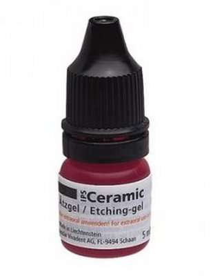 IPS Ceramic is a hydrofluoric acid (4%) used to etch the internal aspects of ceramic restorations, preparing them for cementation. This gel enhances the effect of adhesion between the composite cement and the ceramic surface.