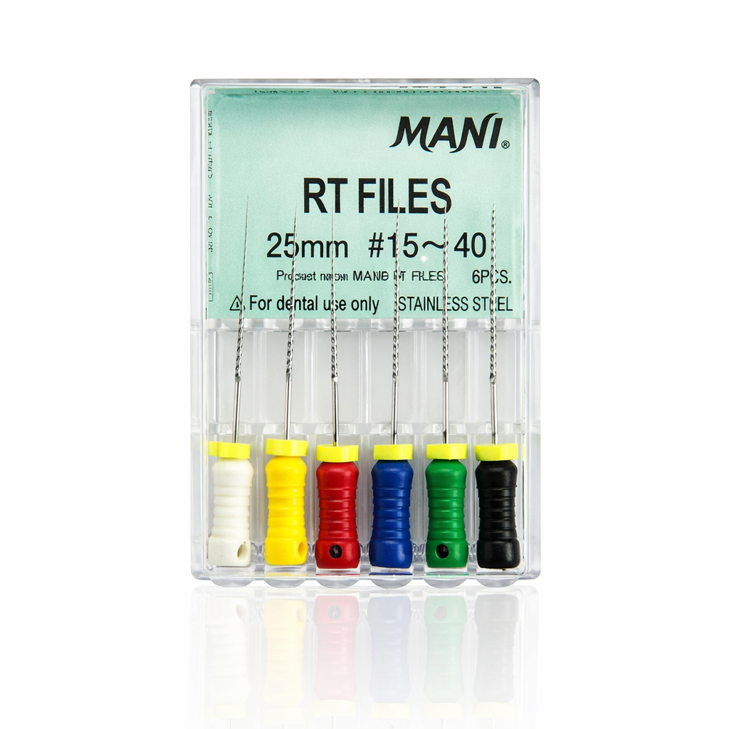 Mani RT File 25mm (Sizes 15–40) is a precision-engineered stainless-steel endodontic file manufactured by Mani, Japan, designed for root canal cleaning, shaping, and enlargement with maximum control and efficiency. The RT File (Reamer Type) features a triangular cross-section that delivers superior cutting efficiency with minimal torsional stress. Its flexible and durable design makes it ideal for both straight and moderately curved canals, while the 25mm working length provides excellent reach in posterior and long canals.
