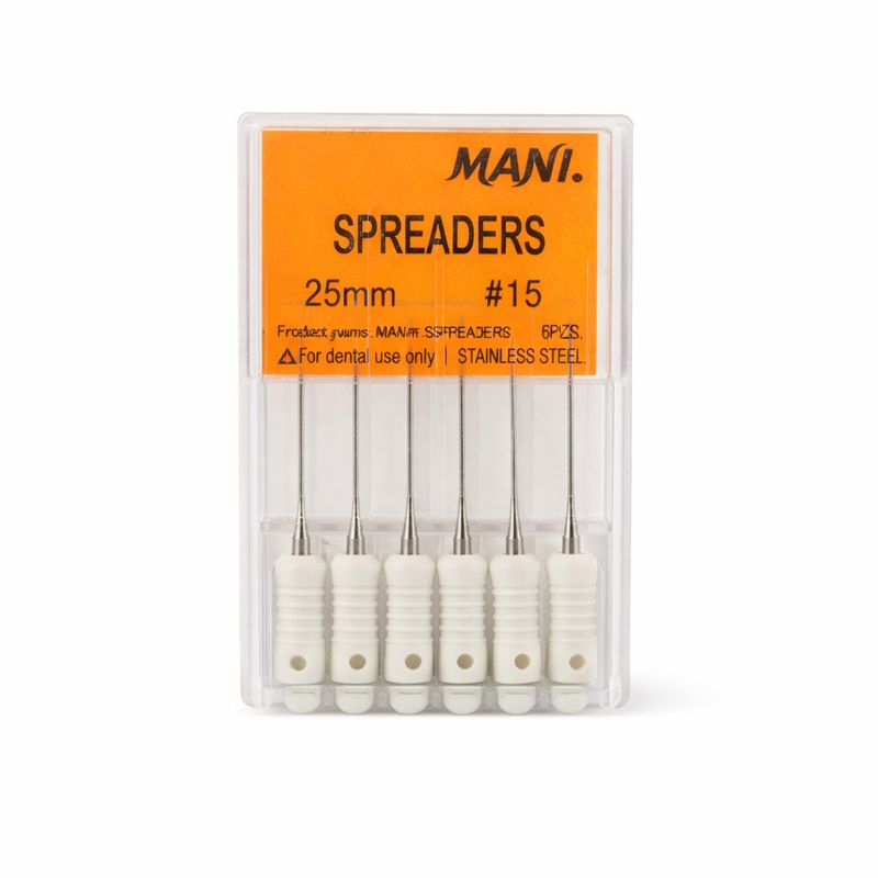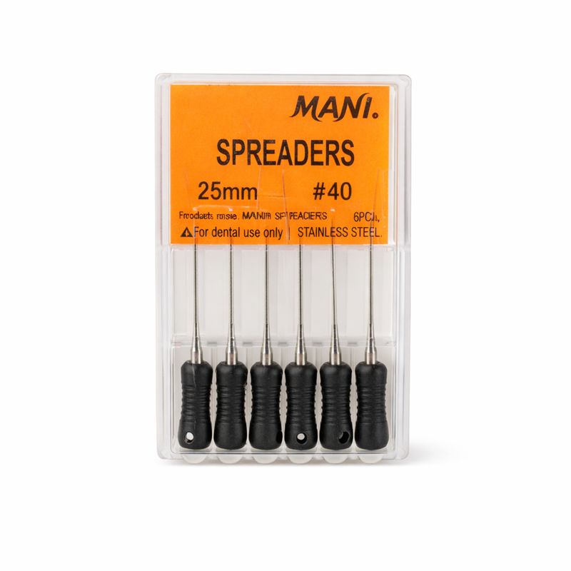Mani Spreaders 25mm (Sizes 15–40) are premium stainless-steel endodontic instruments manufactured by Mani, Japan, specifically designed for lateral condensation of gutta-percha during root canal obturation. These spreaders provide precise lateral compaction of filling material to achieve a dense, three-dimensional root canal seal. The 25mm working length makes them ideal for use in posterior or longer root canals, offering excellent reach, flexibility, and operator control.