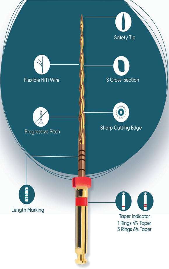 Neoendo S rotary file is designed to have a special S-shaped cross-section allowing minimum radial wall contact, reducing stress on the file. The excellent upward debris auguring prevents debris from being pushed apically. Proprietary heat treatment ensures flexibility and fracture resistance.Advantages: Cross-section, Sharp Cutting Edge, Flexible NiTi Wire, Progressive Pitch, Safety Tip, Length Marking, Tip Size Indicator.