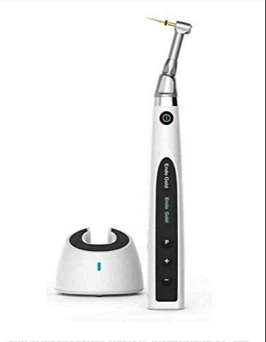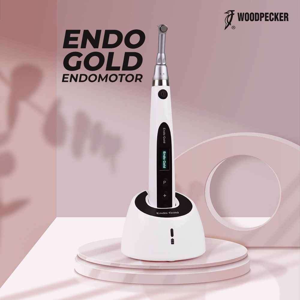 Woodpecker Endo Gold Endomotor is used in Endodontic treatment for root canal preparation, molding, and cleaning. OLED display includes program sequence, operation mode, battery consumption, speed, torque, and real-time feedback.