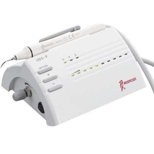 The UDS-P Piezo Ultrasonic Scaler, manufactured by Woodpecker, is used for tooth cleaning and disease prevention. It removes calculus deposits and is used in endodontic therapy. The unit has automatic frequency tracking for optimal performance. Operation is digitally controlled, making it more efficient for scaling than other ultrasonic scalers.